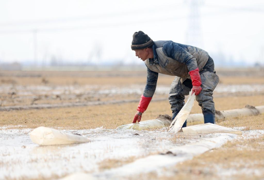 2月22日,河北省滄縣興濟鎮南堤村村民在田間灌溉。