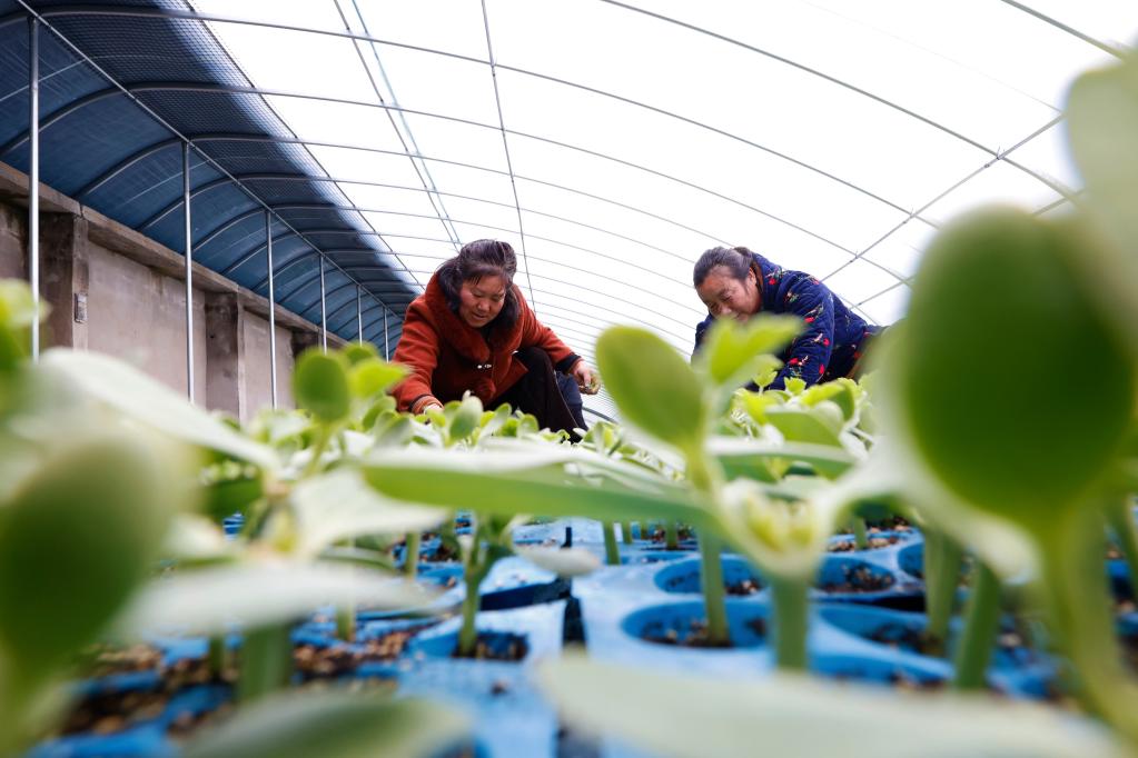 2月22日,在江蘇省泗洪縣魏營鎮西瓜種苗培育基地,瓜農在溫室內嫁接培育西瓜苗。