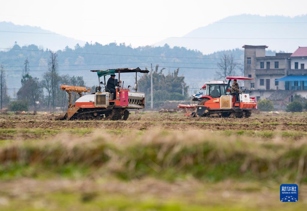 2月22日,在江西省新余市渝水區(qū)南安鄉(xiāng)荊蘭村,農(nóng)民駕駛拖拉機、旋耕機翻耕土地。