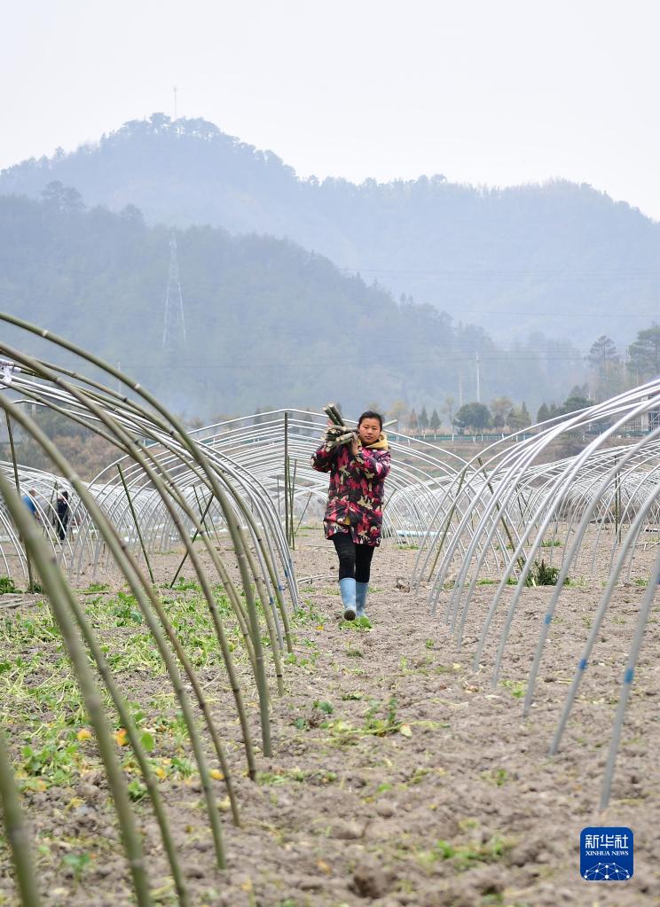 2月22日,農民在湖南省邵陽市城步苗族自治縣蔣坊鄉太和村搭建鋼架大棚,為種植西瓜做準備。
