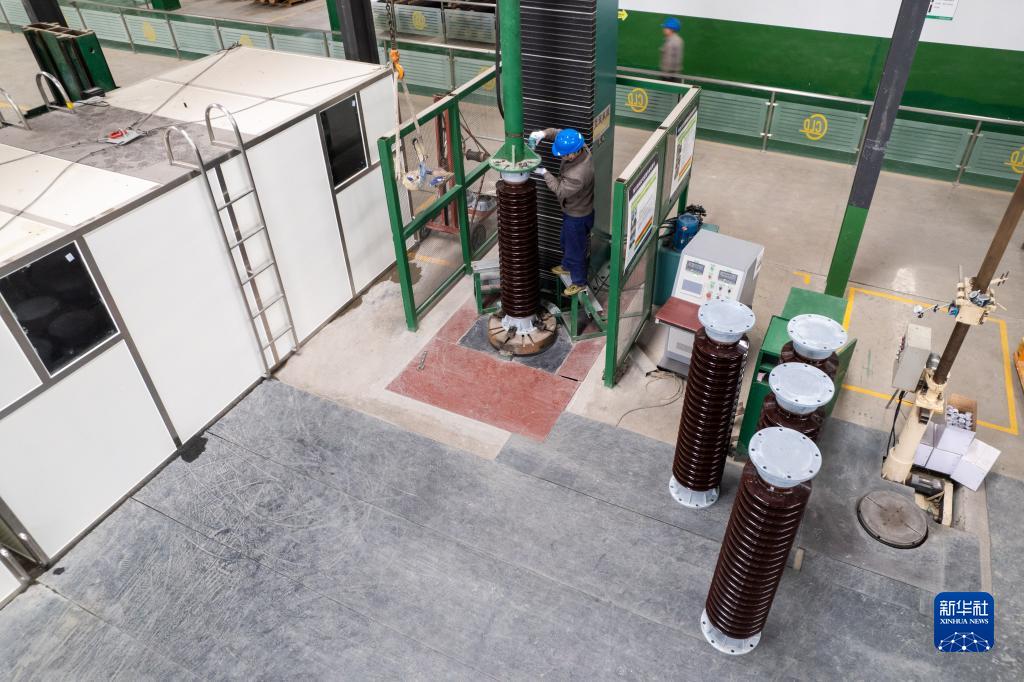 2月22日,在位于醴陵市的湖南陽東電瓷電氣股份有限公司生產車間,工作人員在檢測瓷絕緣子的力學性能(無人機照片)。