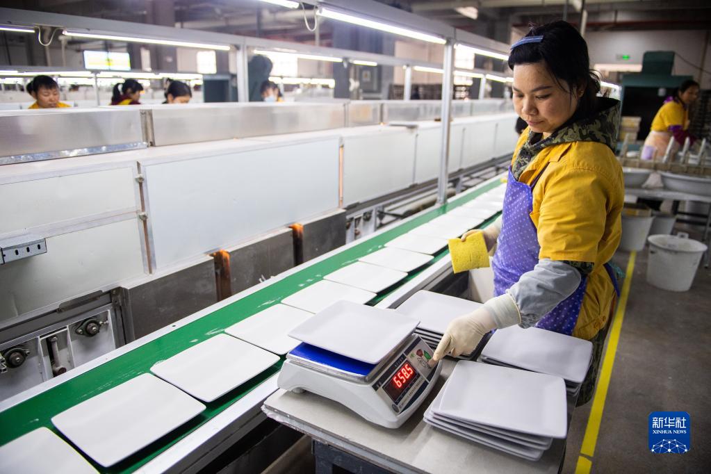 2月22日,在醴陵陶潤實業發展有限公司生產車間,工作人員給生產的瓷器稱重并檢查瓷器品質。