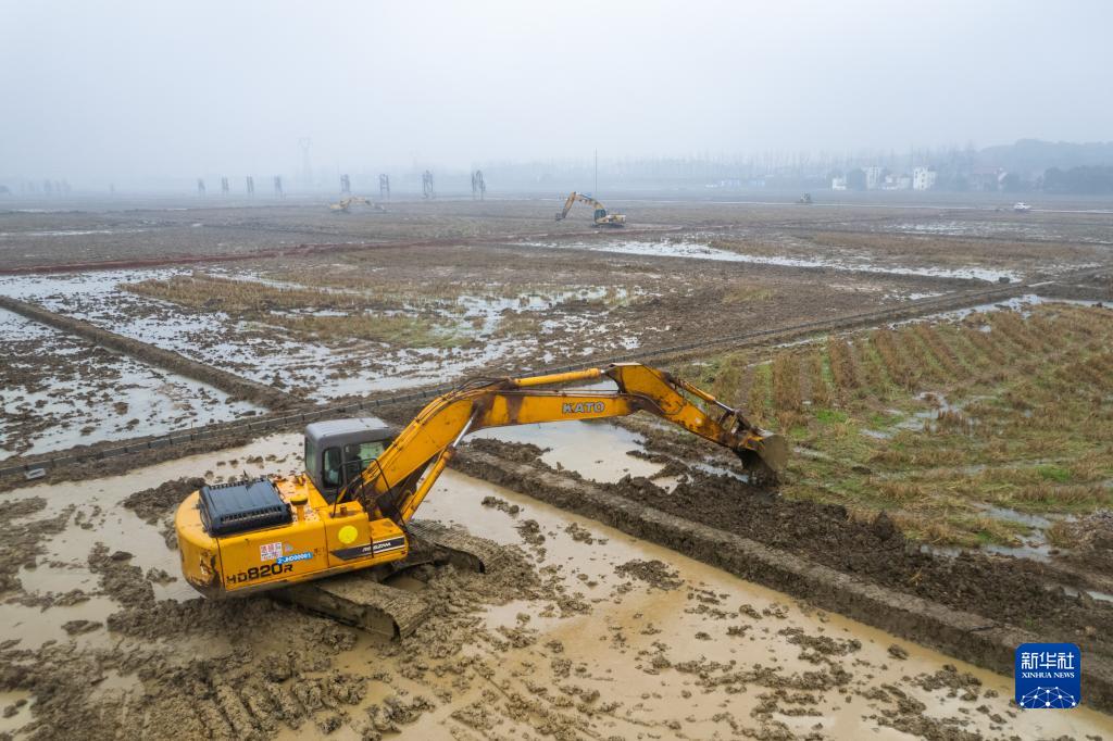 2月9日,在益陽市赫山區(qū)筆架山鄉(xiāng)中塘村,村民進(jìn)行高標(biāo)準(zhǔn)農(nóng)田建設(shè)施工(無人機(jī)照片)。新華社記者 陳思汗 攝