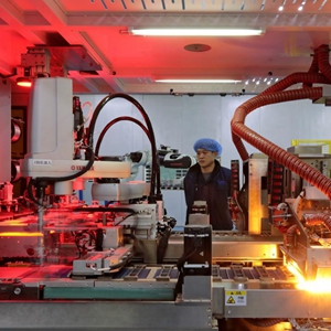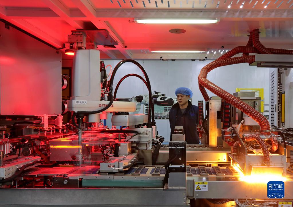 2月22日,保定國家高新技術產業開發區一家太陽能發電板制造企業工人在生產線上工作。