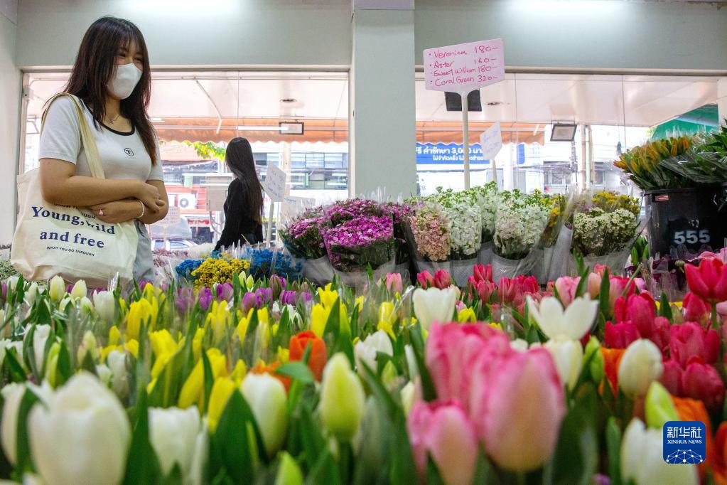 2月21日,顧客在泰國曼谷帕空鮮花市場挑選來自云南的鮮花。