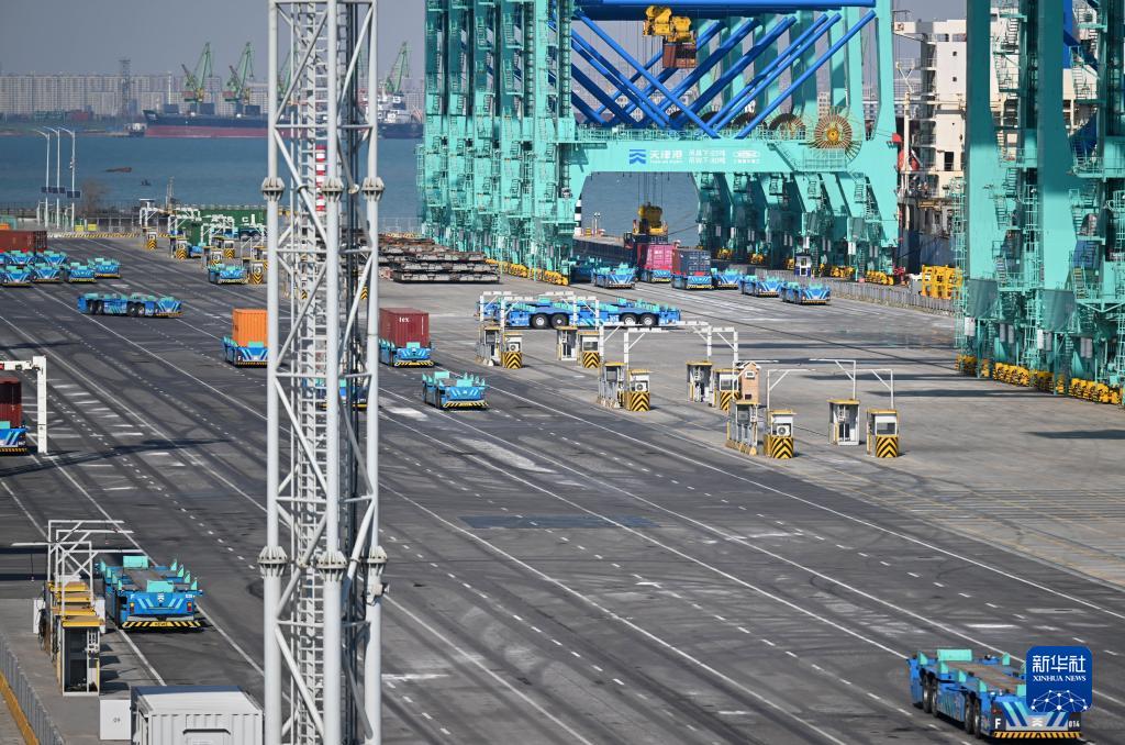 智能水平運輸機器人在天津港全物聯網集裝箱碼頭作業(2月21日攝)。
