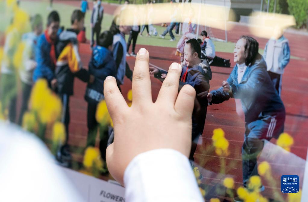 2月22日,在“融合無障愛、攜手向未來”殘障融合主題兒童青少年攝影作品巡展上,北京市盲校學生用手機聽取展品的內容時用手觸碰。