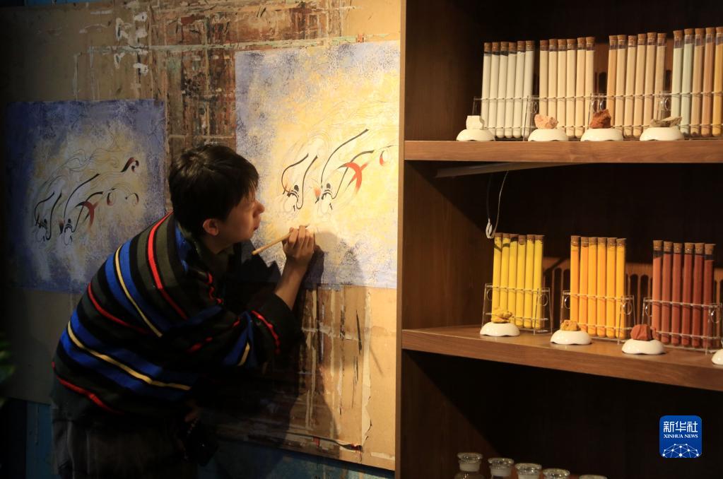 2月22日,在敦煌小鎮鳴沙書院,來自甘肅的學員朱俊峰學習敦煌壁畫臨摹技藝。