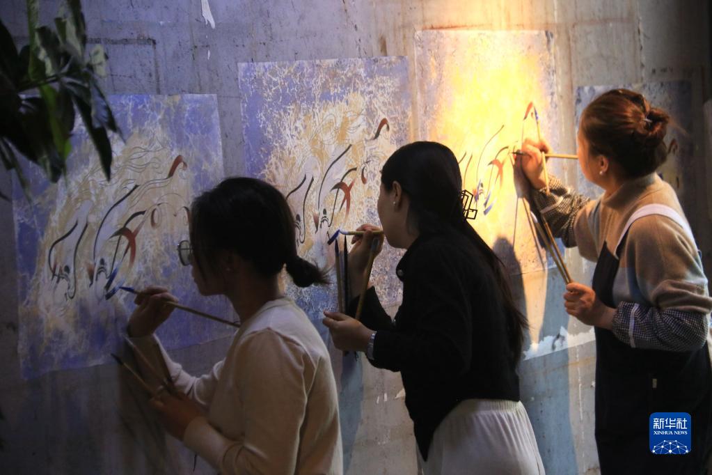 2月22日,在敦煌小鎮鳴沙書院,學員學習敦煌壁畫臨摹技藝。
