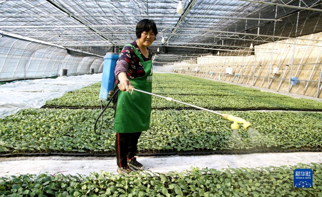 2月22日,北京市大興區龐各莊鎮一家合作社的農民在大棚內給秧苗噴水。