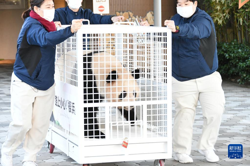 2月22日,在日本和歌山縣白浜町的“冒險世界”樂園,工作人員運送大熊貓“櫻浜”。