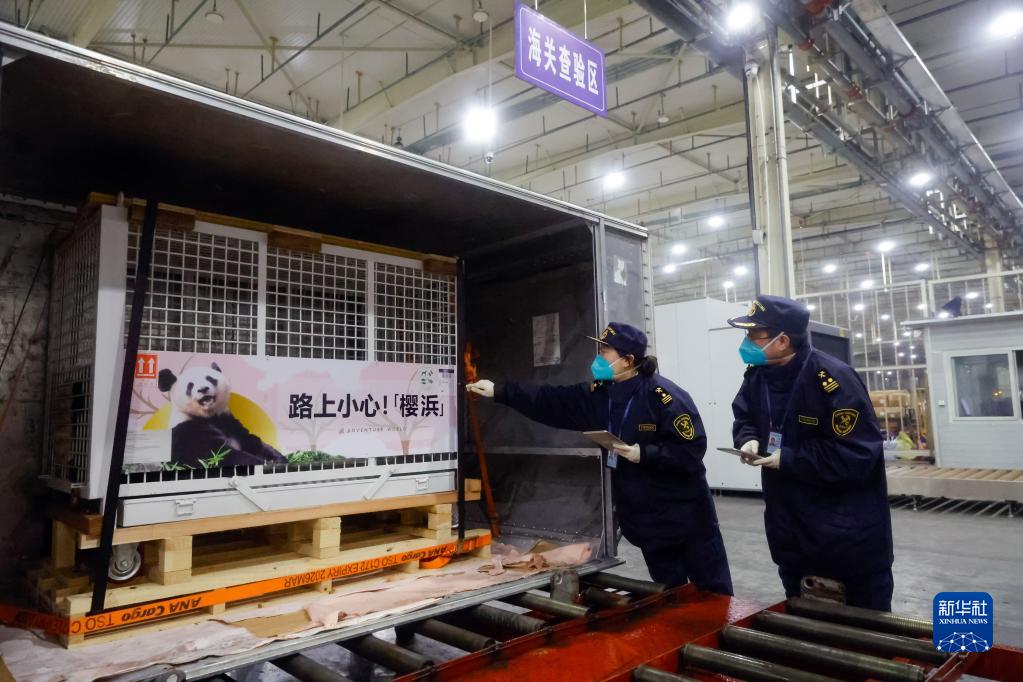 2月23日凌晨,在成都雙流機場海關的查驗區,海關工作人員在查驗運抵中國的大熊貓“櫻浜”。