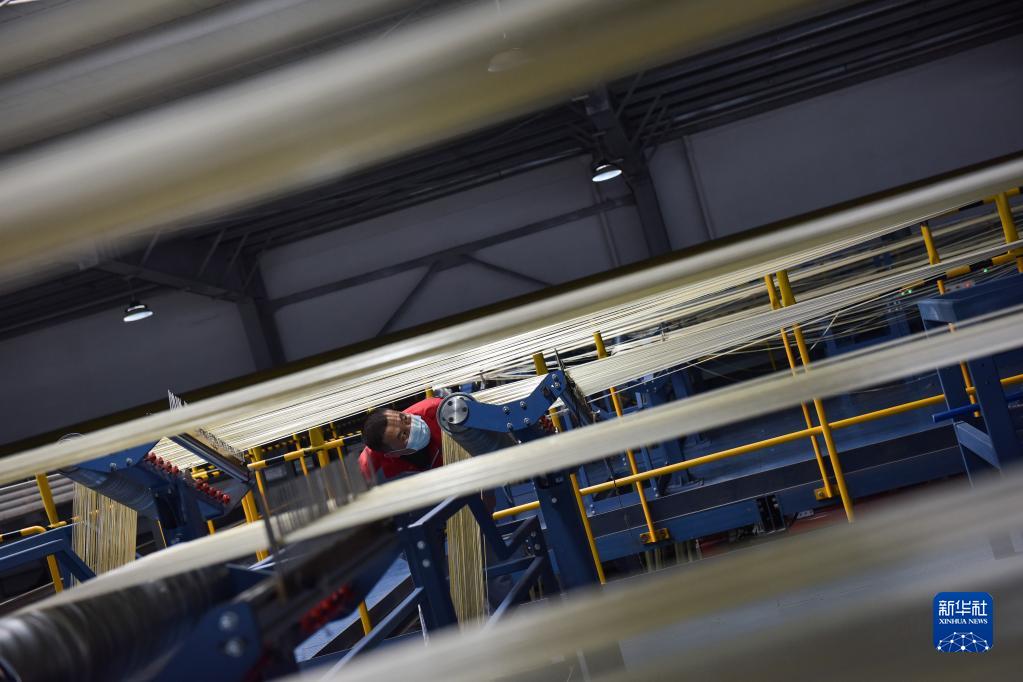 2月22日,在中復神鷹碳纖維西寧有限公司,工作人員在整理碳纖維原絲。