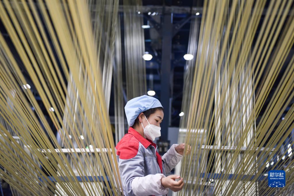 2月22日,在中復神鷹碳纖維西寧有限公司,工作人員在整理碳纖維原絲。