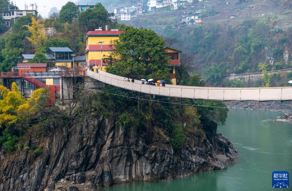 2月22日,游客通過架設在怒江上的吊橋進入云南省福貢縣施底村秘境灣。