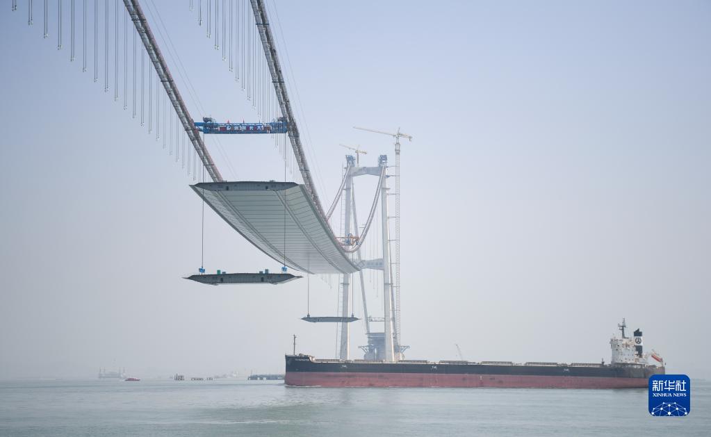 2月22日,貨輪通過正在吊裝鋼箱梁的深中通道伶仃洋大橋。