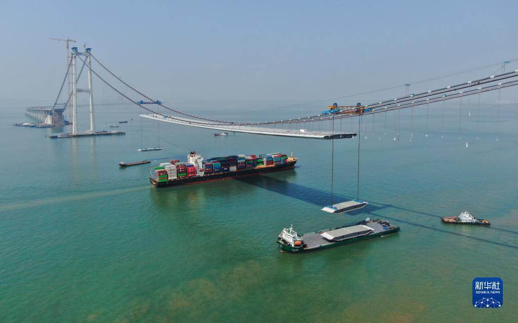 2月22日,集裝箱貨輪通過正在吊裝鋼箱梁的深中通道伶仃洋大橋(無人機照片)。