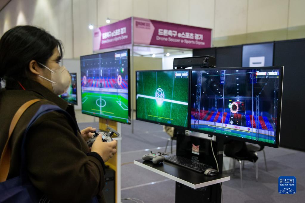2月23日,參觀者在韓國釜山舉辦的2023韓國無人機展上體驗無人機游戲。
