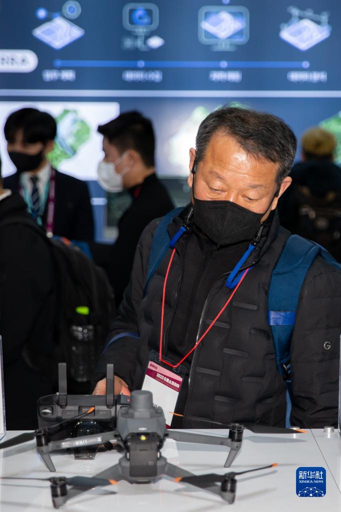 2月23日,參觀者在韓國(guó)釜山舉辦的2023韓國(guó)無人機(jī)展上觀看大疆無人機(jī)。