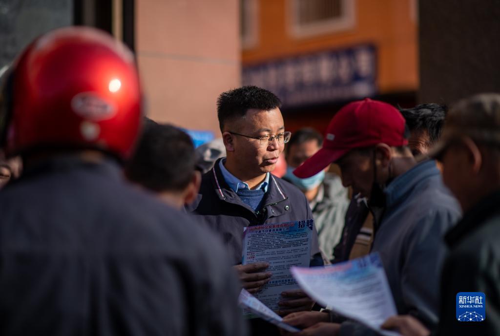 在云南省曲靖市,袁海波(中)在人才市場向務(wù)工人員發(fā)放就業(yè)宣傳單并介紹就業(yè)政策(2月12日攝)。