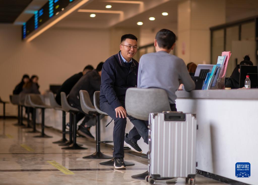 在云南省曲靖市麒麟?yún)^(qū)人力資源服務產(chǎn)業(yè)園,袁海波(左)向準備出發(fā)的務工人員了解就業(yè)需求(2月11日攝)。