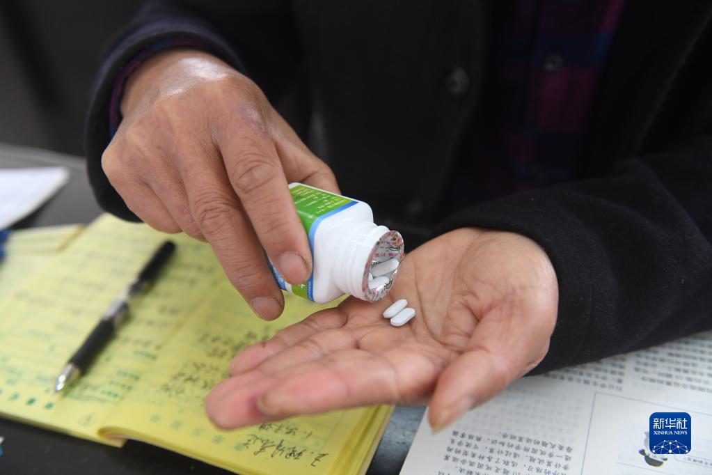 在廣西賓陽縣王靈鎮中心學校七新教學點,王英紅老師準備吃藥(2月22日攝)。