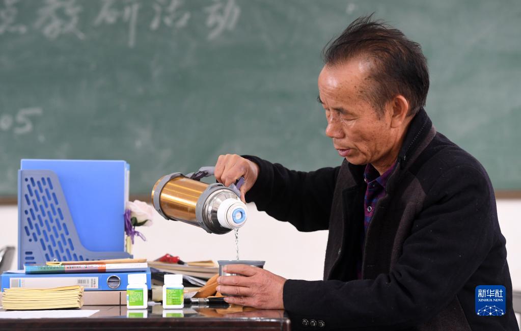 在廣西賓陽(yáng)縣王靈鎮(zhèn)中心學(xué)校七新教學(xué)點(diǎn),王英紅老師倒水準(zhǔn)備吃藥(2月22日攝)。