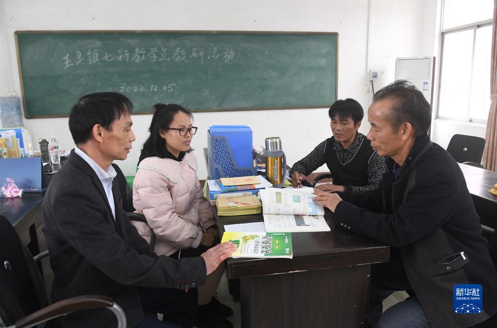 在廣西賓陽縣王靈鎮中心學校七新教學點,王英紅老師(右一)和同事一起探討教學方法(2月22日攝)。