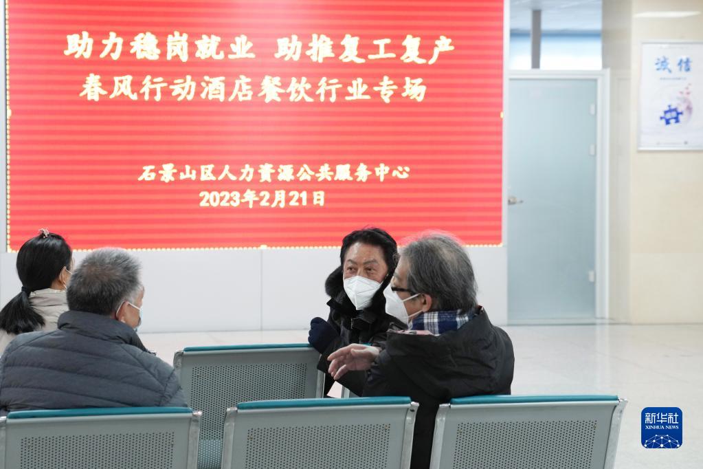 在北京市石景山區人力資源公共服務中心,參加春風行動酒店餐飲行業招聘專場的求職者在交流(2月21日攝)。