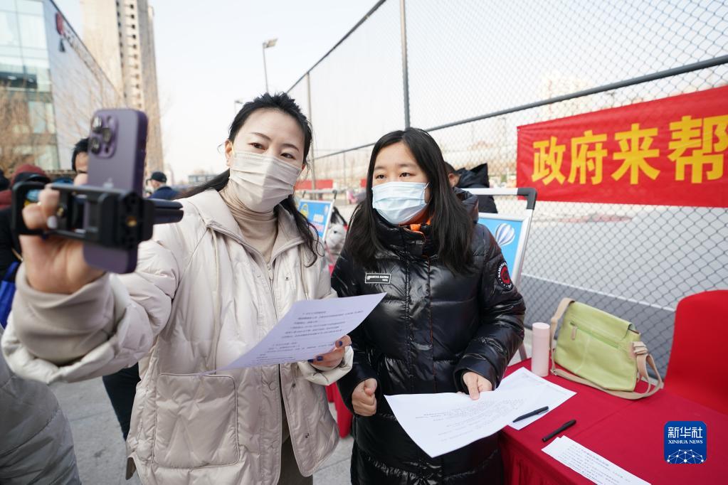 在北京市石景山區(qū)八寶山街道的復(fù)工復(fù)產(chǎn)招聘會(huì)上,石景山區(qū)人力資源公共服務(wù)中心職業(yè)指導(dǎo)師馬建穎(左)在現(xiàn)場(chǎng)直播帶崗,介紹企業(yè)崗位信息(2月22日攝)。