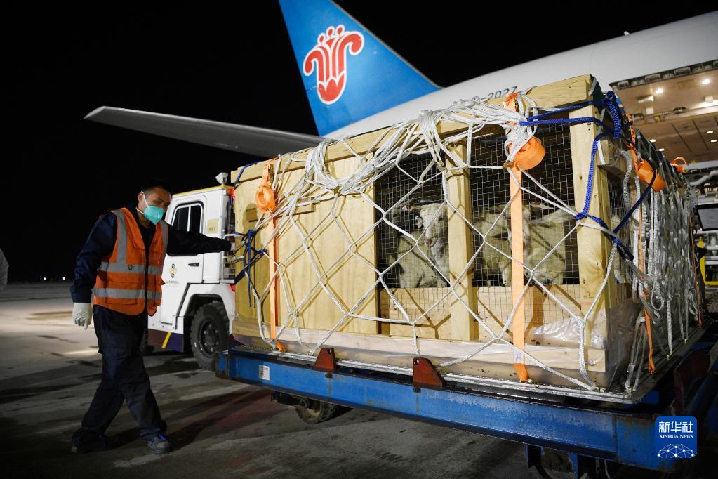 銀川河東國際機場工作人員對種羊進行轉運(2月22日攝)。