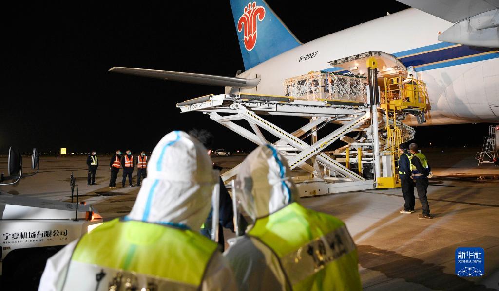 銀川海關(guān)及銀川河?xùn)|國際機(jī)場工作人員對種羊進(jìn)行檢疫、消殺、轉(zhuǎn)運(yùn)(2月22日攝)。