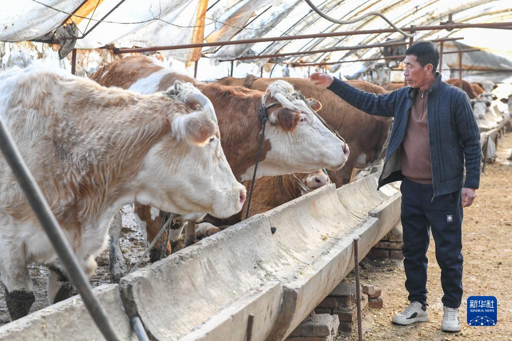 2月22日,農民曲艷偉在吉林市永吉縣北大湖鎮(zhèn)桄子溝村查看肉牛健康狀況。