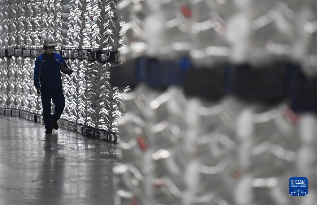 蘭州石化公司聚烯烴運行二部工作人員楊紹光在庫房內查看產品(2月21日攝)。