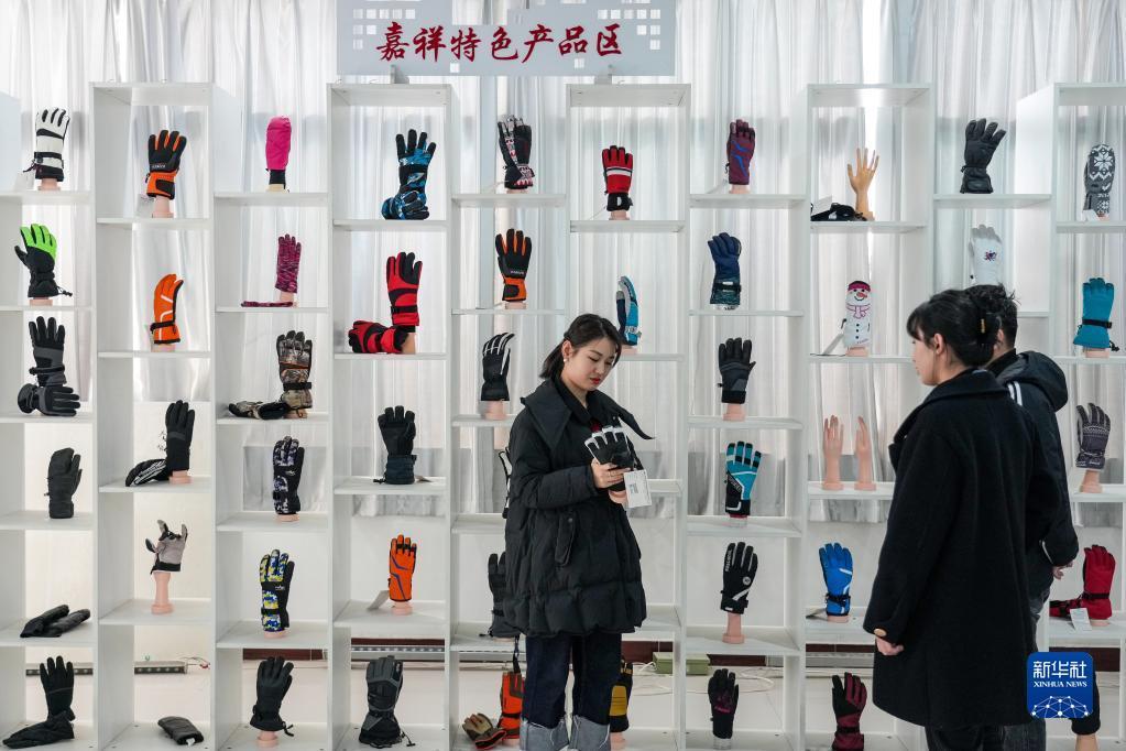 2月23日,在嘉祥縣的一家手套生產企業,員工向客戶介紹手套新品。