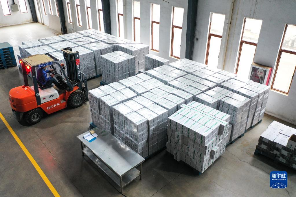 2月22日,貴州省普安縣茶源街道一家茶企的工人在搬運將出口俄羅斯的茶葉(無人機照片)。