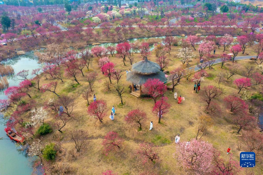 2月18日,游客在浙江省湖州市長興縣龍之夢東方盆景園賞梅(無人機照片)。
