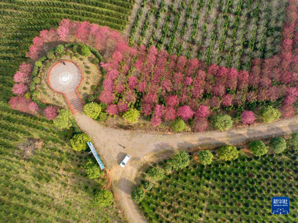 2月18日在江西省撫州市金溪縣新塔園藝觀光園中拍攝的盛開的梅花(無人機(jī)照片)。