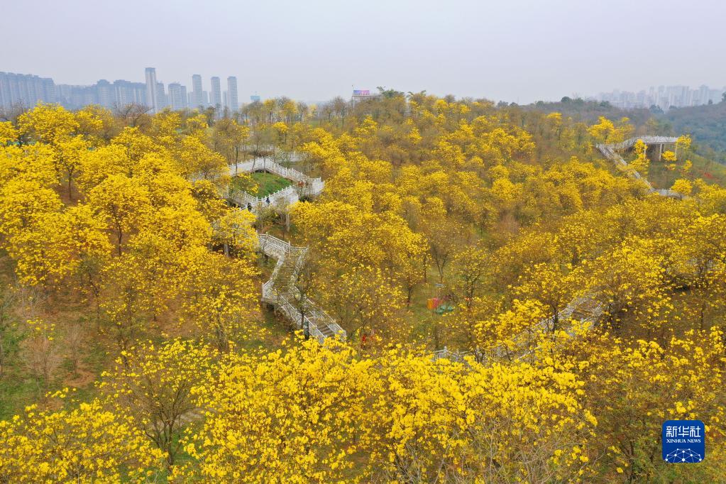 2月23日,游人在廣西南寧市青秀山風(fēng)景區(qū)的風(fēng)鈴谷觀賞綻放的黃花風(fēng)鈴木花(無人機(jī)照片)。
