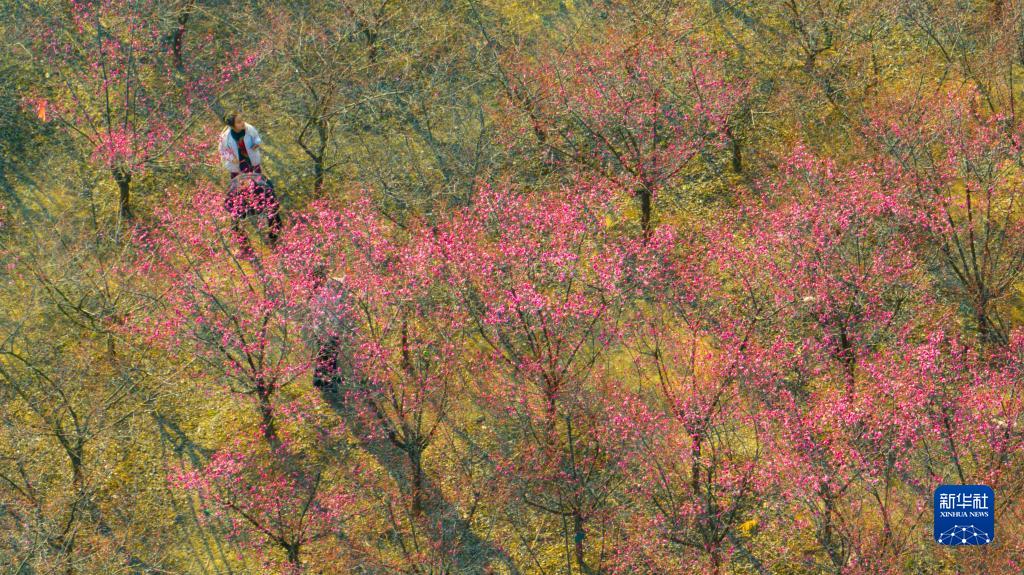 2月19日,安徽省淮北市市民在南湖國家濕地公園梅園游玩(無人機照片)。