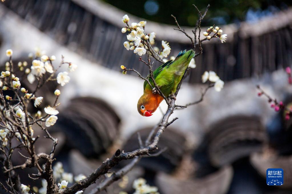2月20日,一只小鳥落在南京梅花山的花枝上。