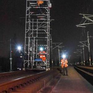 2月23日,綜合維修工在滬寧城際高鐵南京站至仙林站區(qū)間對(duì)接觸網(wǎng)進(jìn)行檢修維護(hù)。