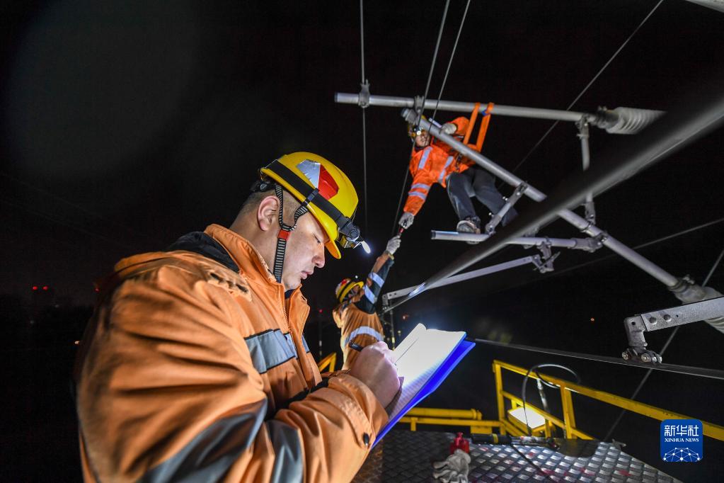2月23日,一名綜合維修工在滬寧城際高鐵南京站至仙林站區(qū)間記錄接觸網(wǎng)檢修維護(hù)情況。