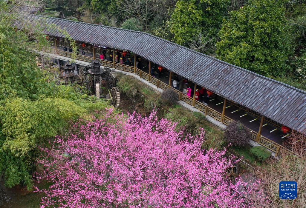 春回大地,在湖南省張家界市武陵源區黃龍洞景區,梅花爭艷綻放,春意盎然,吸引人們來到戶外踏春賞花,樂享春光。
