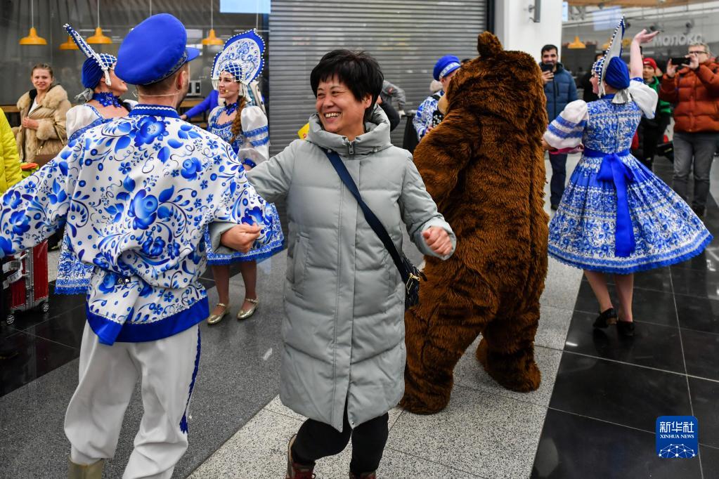 2月23日,在俄羅斯莫斯科的謝列梅捷沃機場,中國游客在歡迎活動中與工作人員跳舞。