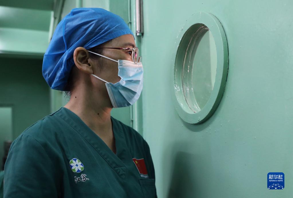 2月22日,在坦桑尼亞桑給巴爾島納茲莫加醫院,婦產科醫生徐信蘭注視著正在進行手術的手術室。