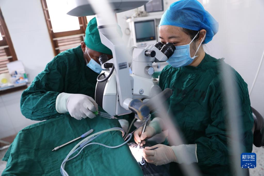 2月23日,在坦桑尼亞桑給巴爾島納茲莫加醫(yī)院,眼科醫(yī)生董莉莉(右)給病人做白內(nèi)障超聲乳化摘除手術(shù)。