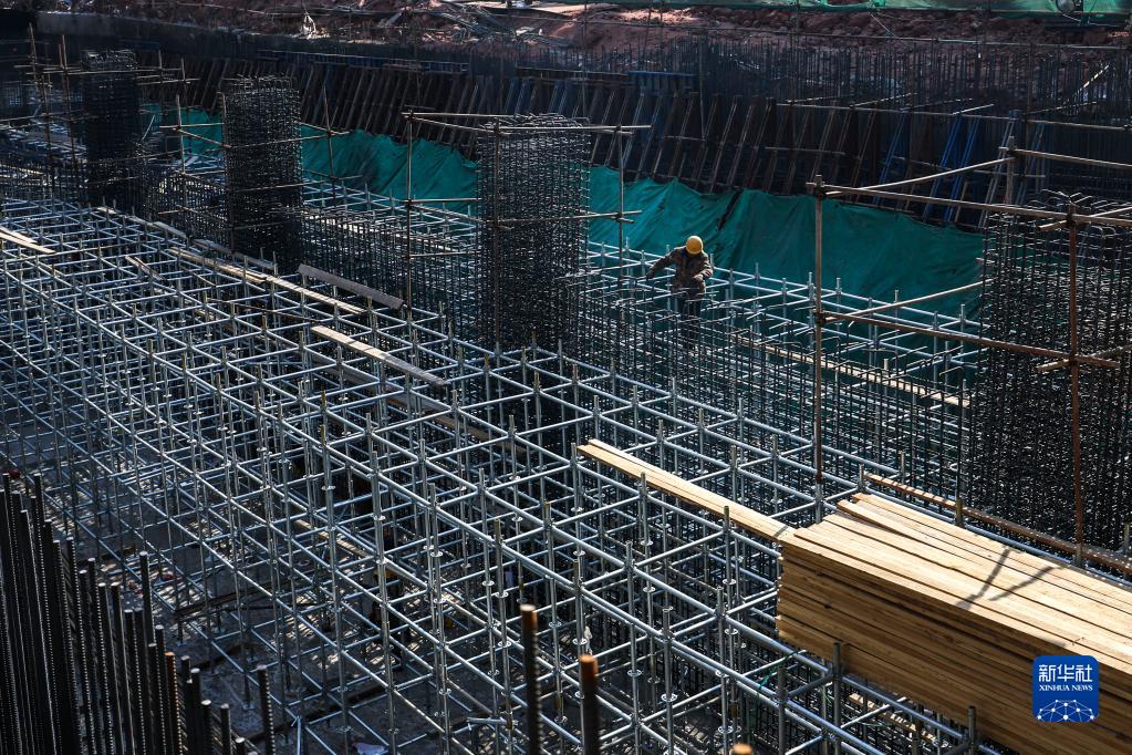 工人在長春市城市軌道交通6號線03標段三工區華慶路站施工現場作業(2月23日攝)。