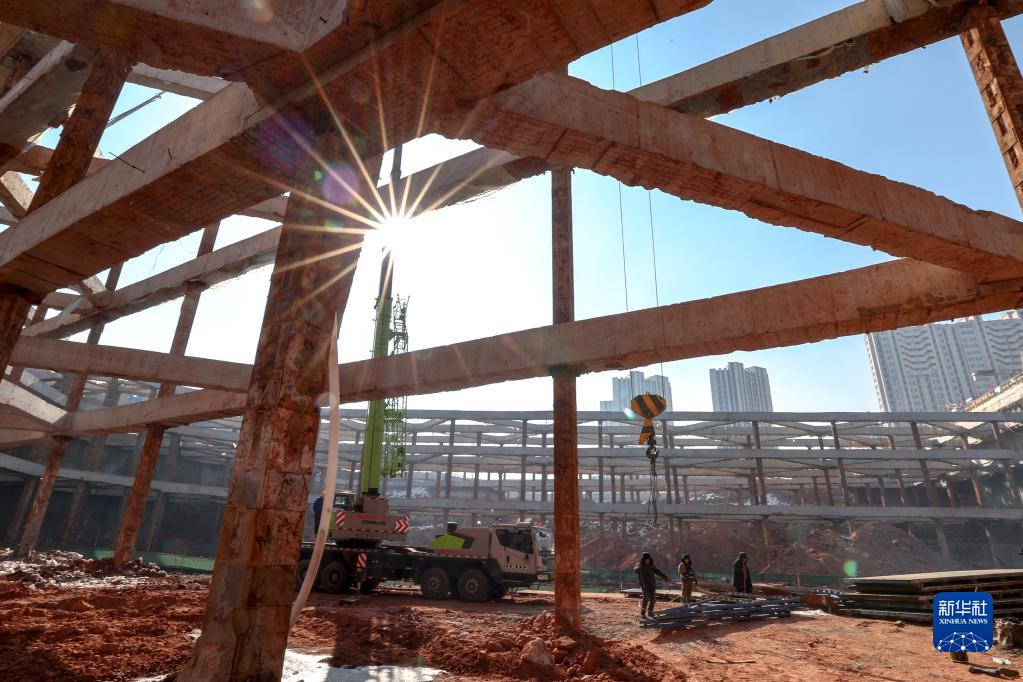 工人在長春市城市軌道交通6號線03標段三工區華慶路站施工現場作業(2月23日攝)。