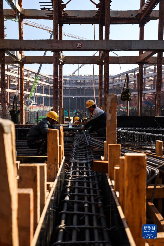工人在長春市城市軌道交通6號線03標段三工區華慶路站施工現場作業(2月23日攝)。